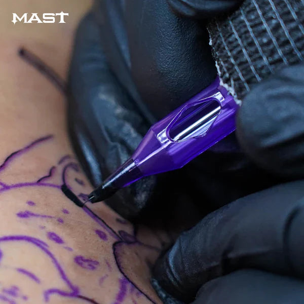 Artistic arrangement of Kwadron Cartridge System needles showcasing various sizes and configurations.Photograph showing a Mast Pro Tattoo Cartridge in magnum configuration in action. The cartridge is being used in a tattooing process, demonstrating its functionality and performance.