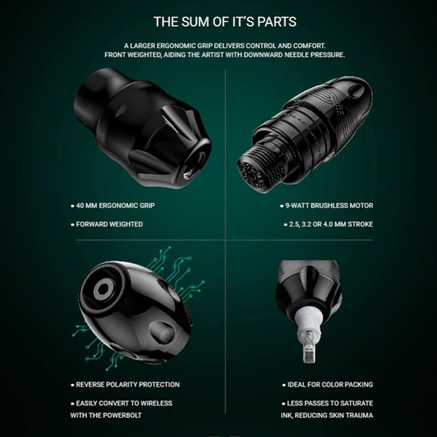 Cordless convenience – 2 batteries for continuous tattooing sessions, eliminating the hassle of cables and external power supplies.