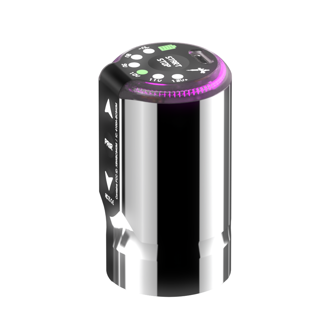 The Powerpack is controlled with a simple button system or can be connected to the Ink Machines app and Ink Machines pedal. It features LED indicators showing the current voltage level between 7 and 12 volts, the current battery level and three buttons, as well as a multi-color halo glow that can be adjusted via the app.