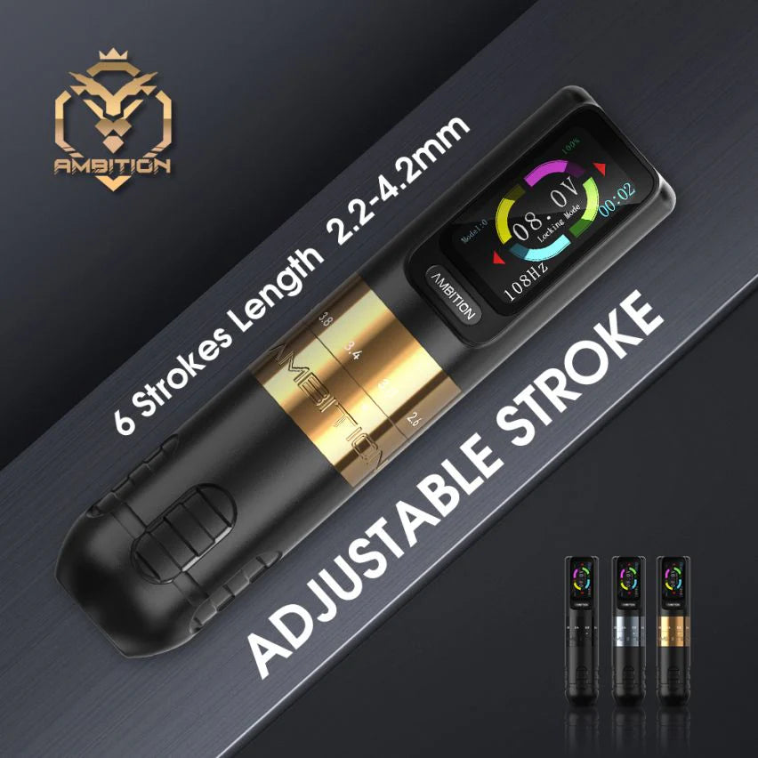Регулируем ход на иглата, което става много плавно и лесно със завъртане на ринга над ръкохватката, до избиране на желаната степен. Много е лека, с удобна ръкохватка която приляга перфектно в ръката. Моторът е направен от качествени материали и е много надежден. Батерията има капацитет от цели 2400mAh което я прави една от най-издръжливите на пазара (с до цели 8часа непрекъсната работа) и зареждане от само 2часа.